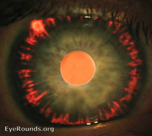 Iris transillumination defects. Click on image to enlarge. Photo courtesy of Andrew Doan, MD, PhD. EyeRounds.org, The University of Iowa.