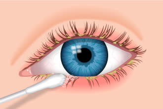 Use a cotton-tipped swab to apply cleaning solution recommended by your eye doctor. Rub gently around the edges of your upper and lower eyelids, but do not get cleaning solution in your eye.