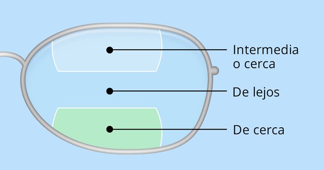 Los trifocales tienen tres puntos de enfoque, habitualmente para visión de lejos, intermedia y de cerca. El segmento intermedio de los lentes trifocales está directamente por encima del segmento de visión de cerca y se usa para mirar objetos a cierta distancia.